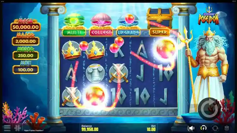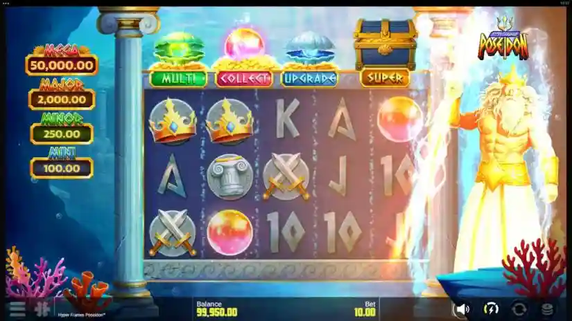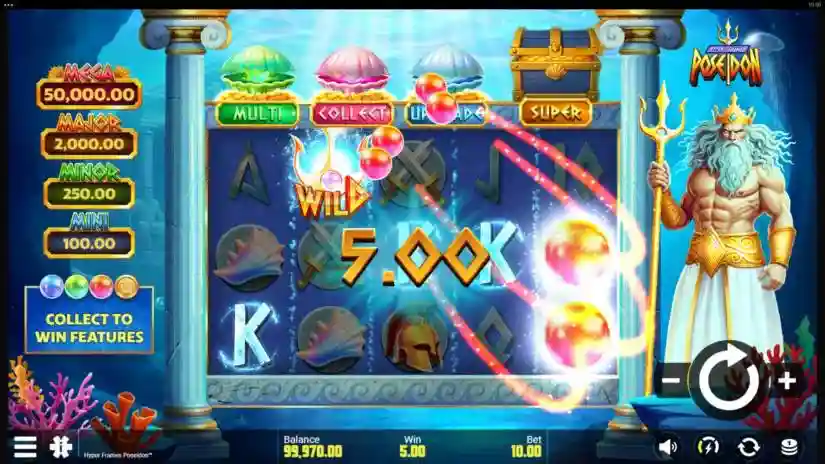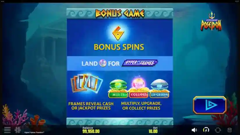 The Poseidon Feature can only be activated from the main game. When activated, the Poseidon Feature awards a Hyper Frames™ Bonus with a random combination of Boosters and/or Super Bonus features.
