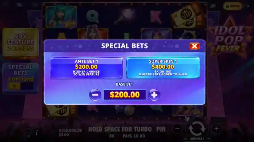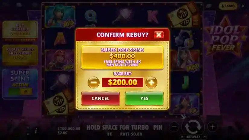 The maximum win in Idol Pop Fever is capped at 5,000x the bet. If the total win during the FREE SPINS round reaches 5,000x the bet, the round ends immediately, the winnings are awarded, and all remaining free spins are cancelled.