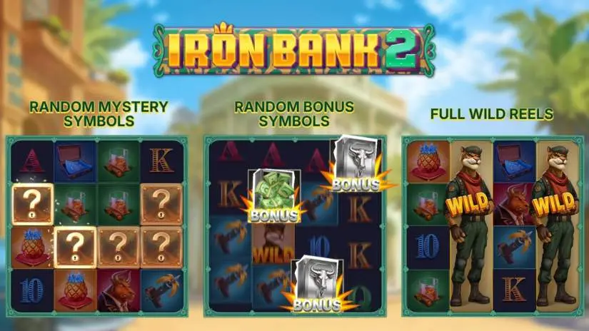 Matching symbols in any position on three or more adjacent reels of the Iron Bank 2 slot, starting from the leftmost one, creates a winning combination.