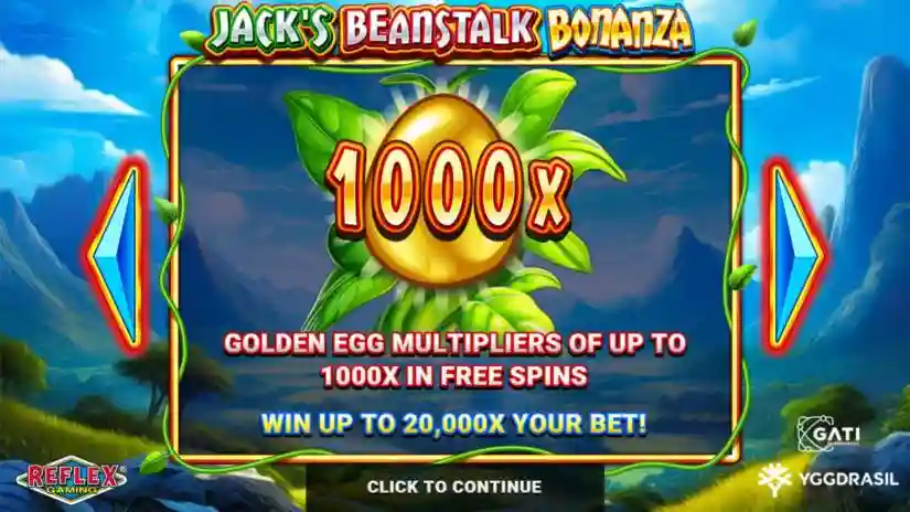 During the Free Spins bonus, a golden version of the Beanstalk is active; a Golden Egg is shown at the top with a minimum multiplier, which can be awarded by any Eggs landing on the reels.