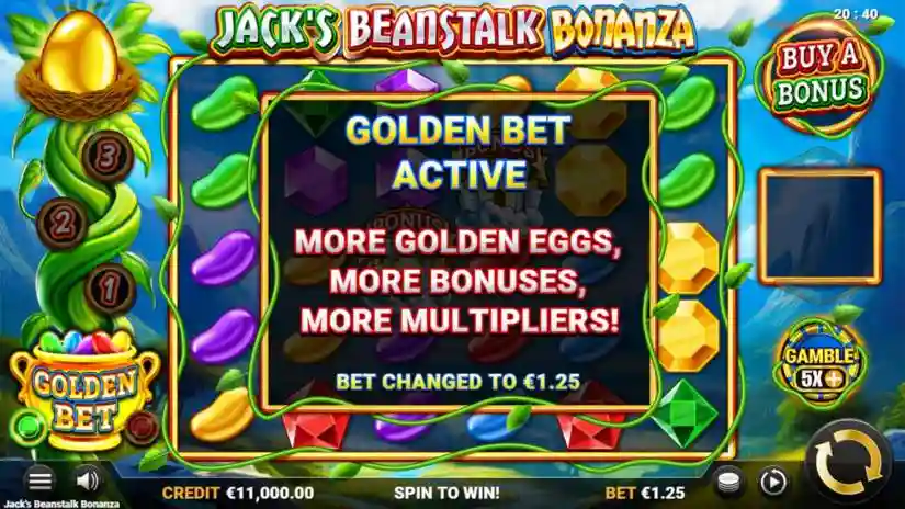 The player can increase their bet by 1.25x; this increases the chance of reaching the top of the Beanstalk, increases the likelihood of egg multipliers, and increases the chance of triggering free spins.
