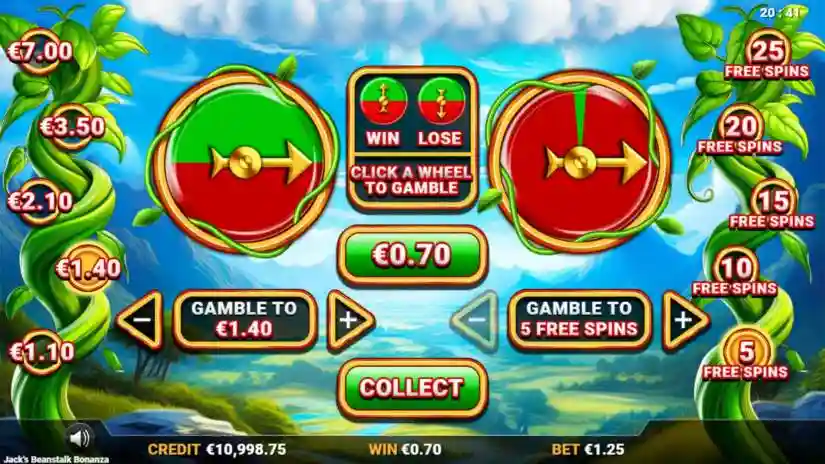 The gamble bet offers two options. On the left gamble wheel, the current prize can be multiplied by 1.5x, 2x, 3x, 5x, or 10x; cash gamble bets can be rounded up to the nearest payout amount. On the right gamble wheel, the current prize can be wagered on 5, 10, 15, 20, or 25 free spins. You can change the value you’re betting on using the plus and minus buttons on the sides; your winning odds are displayed on the gamble wheel. Possible gamble bet levels for each option are also displayed on the beanstalk.