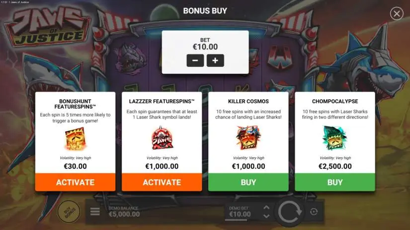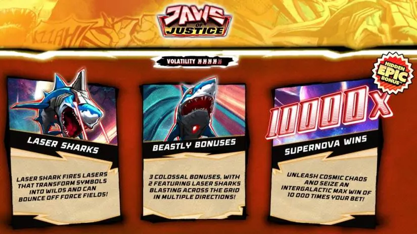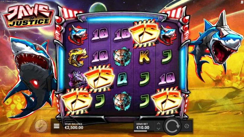 Conquer space in Jaws of Justice from Hacksaw Gaming, a 5-reel, 4-row slot with payline wins. Battle fin and fang for the ultimate win of up to 10,000x your bet, available in all game modes!