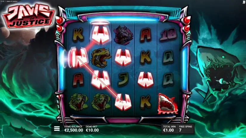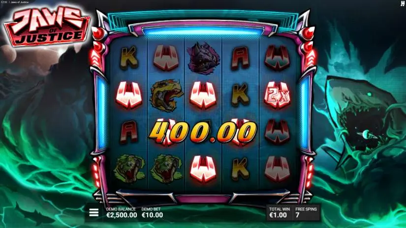 The maximum win in Jaws of Justice is 10,000 times the current bet level. The maximum win can be achieved by activating certain combinations and/or features.