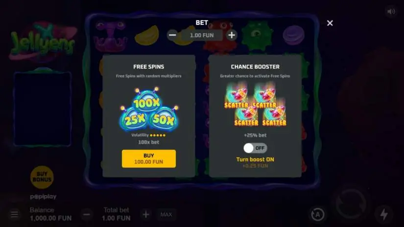 Players can purchase instant access to free spins by paying a certain multiplier added to their current bet. Increasing the bet will automatically increase the value of the Buy Bonus. The number of free spins is randomly selected from three available options: 10, 20, or 30 free spins. After purchase, free spins begin with the next spin. The “Buy Bonus” button will be inactive during free spins or when the Chance Booster is activated.