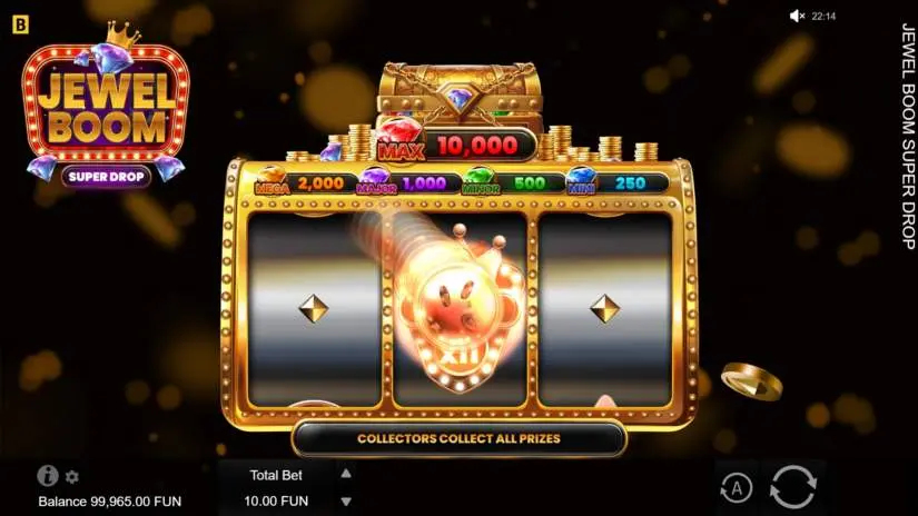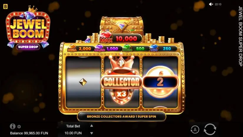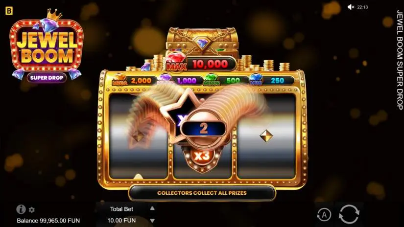 Jewel Boom Super Drop is a 1×3 EZ-Reel™ video slot from BGaming featuring instant wins, super spins, win multipliers, and 5 fixed jackpots. When a coin appears on the screen, the player wins the amount shown on the coin. If the Collector symbol appears, one or more super spins are awarded. Any diamond symbol that appears on the screen enters the jackpot chest.