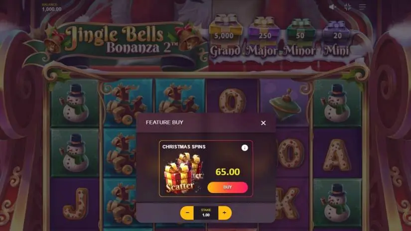 The feature in Jingle Bells Bonanza 2 is launched automatically after confirmation. Refresh the page during the game to see the final result. Feature purchases are activated immediately after clicking the “Buy” button. The cost of each feature purchase is displayed in the “Feature Purchase” pop-up window and depends on the currently selected bet. Feature purchases do not affect jackpots.