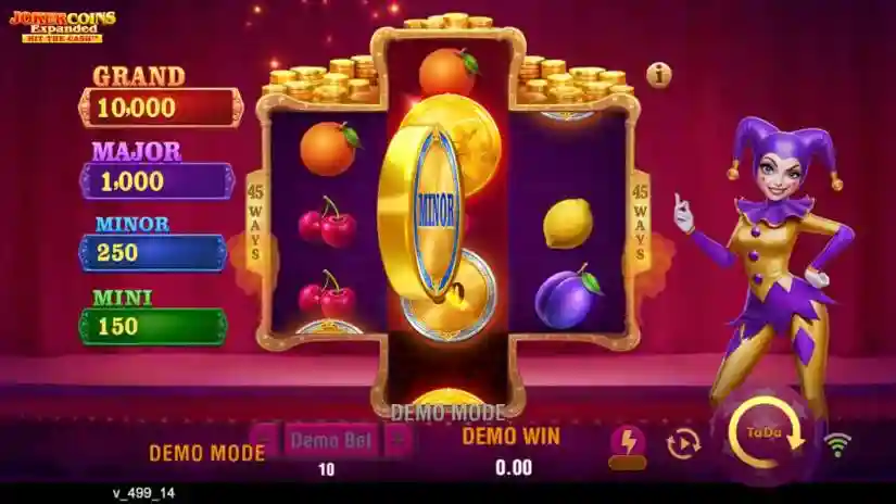 Joker Coins Expanded is a 3-reel slot with a 3-5-3 layout, offering 45 ways to win. Starting with the leftmost reel, all winning symbols are paid from left to right on adjacent reels. Only the highest win on each path is paid. When multiple winning combinations occur, all winning points are added together. Cash prizes are awarded according to the game rules, regardless of the winning methods. Winning combinations and payouts are calculated according to the paytable.