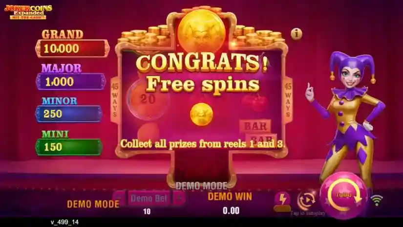 Upon entering the bonus game, all coin bonuses from the main game are automatically transferred to the bonus game. Once entered, the Joker Coin Bonus Symbol will begin collecting coin bonuses on reels 1 and 3.