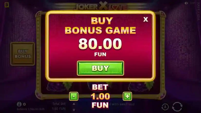 Feel our true love for you while playing the enchanting Joker X Love slot from BGaming! The reels are filled with romantic charm and offer huge winning potential. Spin the reels and enjoy vibrant fruit symbols enchanted by the “Love Joker,” forming winning combinations that will make you fall in love! What’s more, you can play the bonus game with incredible multipliers of up to 999x!