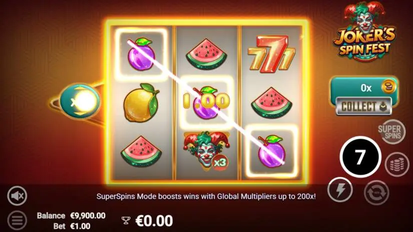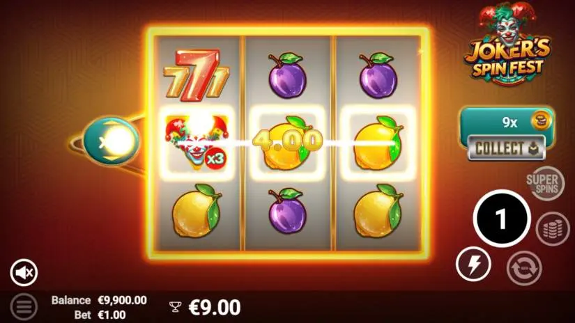 The maximum win in Joker’s Spin Fest is capped at 10,000x the bet. If the maximum win in a round reaches 10,000x the bet, the round ends immediately, the winnings are awarded up to the cap, and all other features are terminated.