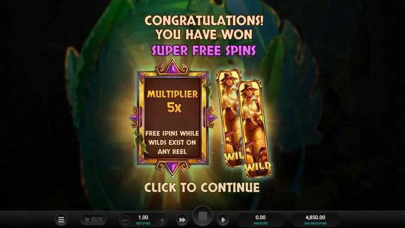 Locating three Free Spins symbols triggers the Free Spins round. The Free Spins round continues as long as Wild symbols remain on the reels. The multiplier meter to the left of the reels increases by 1x with each spin. The Free Spins round ends when all Wild symbols leave the reels, and the player returns to the main game. During the Super Free Spins, the round starts with a 5x multiplier.