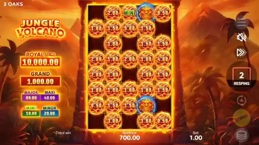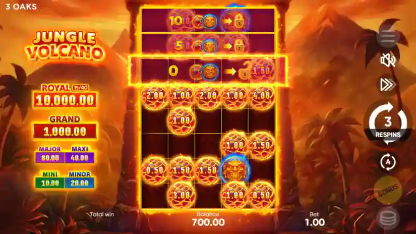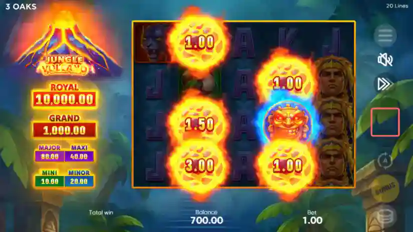 In Jungle Volcano by 3 Oaks Gaming, the highest-paying combination from left to right pays out. The number of paylines is fixed at 20. Simultaneous or matching wins on different paylines are added together and paid out. The highest-paying combination on a line pays out. Scatters wins are added to line wins.
