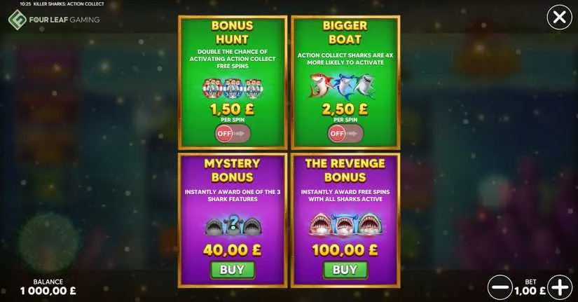 “Killer Sharks: Action Collect” is a five-reel slot machine from Four Leaf Gaming with 20 paylines on a 5×3 grid and 25 paylines on a 5×4 grid. Winning combinations and payouts are calculated according to the paytable. Wins across multiple lines are cumulative. Only the longest matching combination for each symbol pays out. Once a spin begins, the bet level for that round is locked and cannot be changed. Wins are displayed in the user’s currency. The Wild symbol substitutes for all symbols on the reels when evaluating line wins, but does not substitute for the Free Spins symbol. The average theoretical return to player (RTP) for this game is 96.00%. The maximum win limit for this game is 1000x the player’s bet.