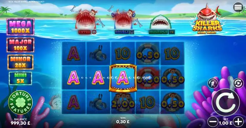 Any “Shark” feature can be activated on any spin. Shark features can be activated in the main game if a shark lands on the center reel of the “Action Collect” feature.
