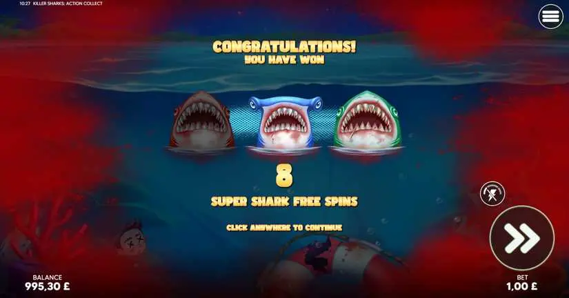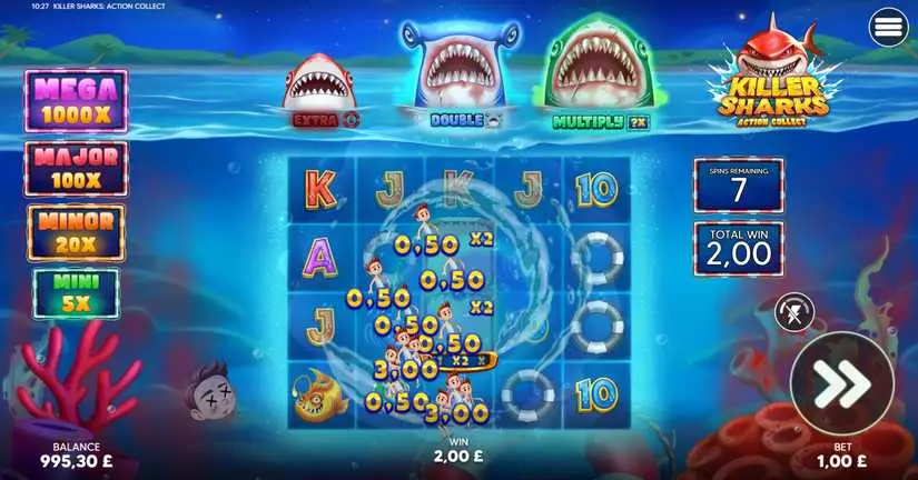 Activating the Blue Shark bonus awards 8 Double Action Collect free spins. The Action Collect reel features a blue shark symbol exclusively in this mode, with a high probability of landing. The reels in this mode are 5×4. Landing the blue shark symbol will collect all the values (rubber ring symbols) in view and award an additional spin. This bonus can be retriggered by activating one of the other Shark bonuses within the bonus feature. Retriggering will award 4 more free spins and combine the Extra Shark bonus features for all remaining spins. Possible ring values (including enlarged): 0.5, 1, 1.5, 2, 2.5, 3, 3.5, 4, 4.5, 5, 5.5, 6, 6.5, 7, 7.5, 8, 8.5, 9, 9.5, 10, 10.5, 11, 11.5, 12, 12.5, 13, 14, 15, 20, 20.5, 21, 21.5, 22, 22.5, 23, 23.5, 24, 24.5, 25, 25.5, 26, 26.5, 27, 27.5, 28, 29, 30, 40, 40.5, 41, 41.5, 42, 42.5, 43, 44, 45, 60, 100, 100.5, 101, 101.5, 102, 102.5, 103, 103.5, 104, 104.5, 105, 105.5, 106, 106.5, 107, 107.5, 108, 109, 110, 120, 120.5, 121, 121.5, 122, 122.5, 123, 124, 125, 140, 200, 200.5, 201, 201.5, 202, 202.5, 203, 204, 205, 220, 300, 1000, 1000.5, 1001, 1001.5, 1002, 1002.5, 1003, 1003.5, 1004, 1004.5, 1005, 1005.5, 1006, 1006.5, 1007, 1007.5, 1008, 1009, 1010, 1020, 1020.5, 1021, 1021.5, 1022, 1022.5, 1023, 1024, 1025, 1040, 1100, 1100.5, 1101, 1101.5, 1102, 1102.5, 1103, 1104, 1105, 1120, 1200.