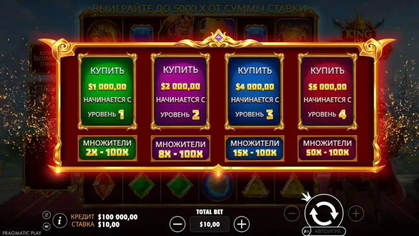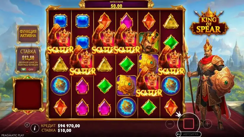 In Pragmatic Play’s King of Spear game, symbols pay out anywhere on the screen. The total number of matching symbols on the screen at the end of a spin determines the winning amount.