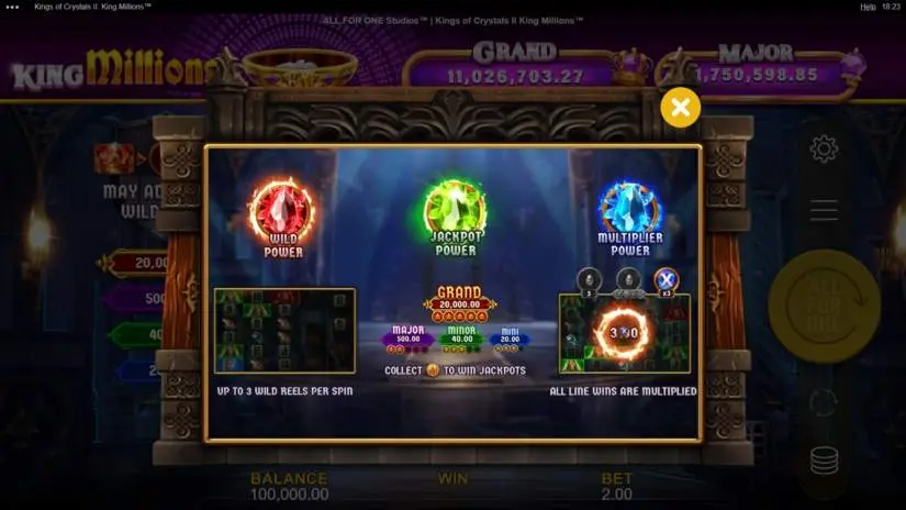 The progressive jackpot in Kings of Crystals 2: King Millions is a prize that continually increases based on a percentage of player bets. Progressive jackpots are available to real money players only. Progressive jackpot winnings are independent of the bet. Values are displayed based on the current exchange rate, which may be updated during gameplay. These values are periodically reviewed and increased. The progressive jackpot value is calculated based on the server-side progressive jackpot value. Every effort has been made to ensure that the progressive jackpot value displayed during gameplay matches the server-side progressive jackpot value. All progressive wins are subject to final approval by the game managers and software provider. Their decision is final, and no correspondence will be accepted. When a progressive jackpot is won, all players worldwide are notified, and the jackpot is reset to its starting value. The same progressive jackpot cannot be won and paid to multiple players. The game managers and software provider reserve the right to change or amend any of these rules and regulations at their sole discretion. If the game managers and software provider cancel any of these rules and regulations, this does not automatically mean they will be canceled in the future. The game managers and software provider reserve the right to cancel or terminate the progressive jackpot at their sole discretion. Accumulated progressive jackpots will be transferred to another progressive jackpot, as specified in the Terms.