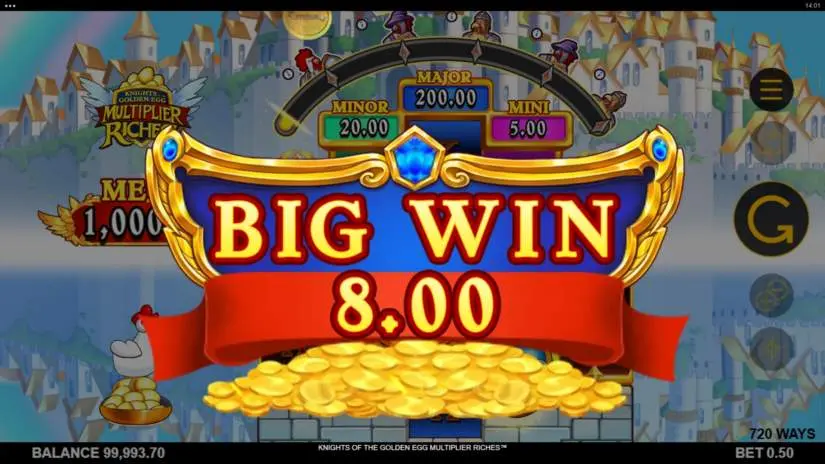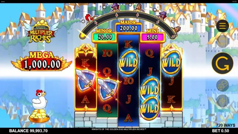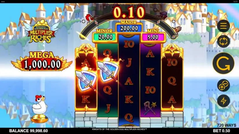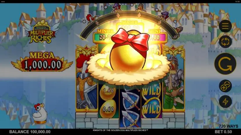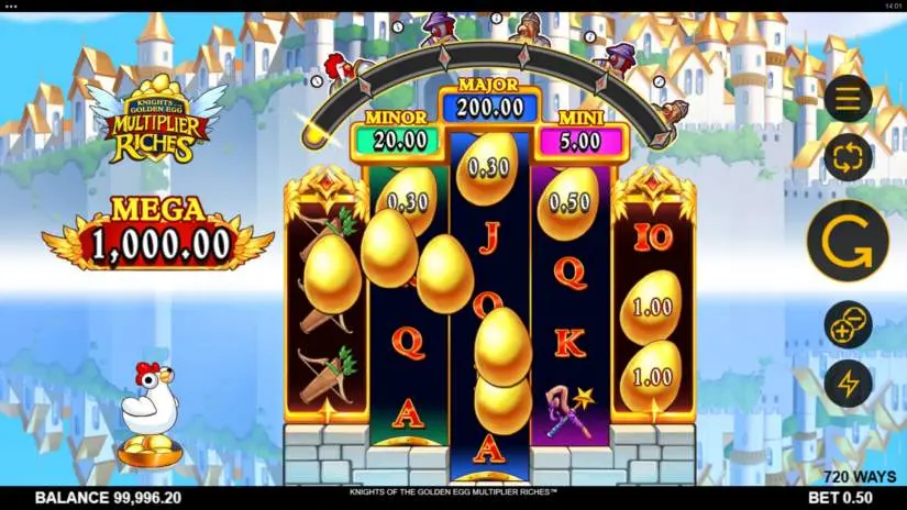 Knights of the Golden Egg Multiplier Riches by Gold Coin Studios is a 5-reel video slot with reel heights of 3-4-5-4-3. The objective of the game is to spin the reels until a winning combination appears. Winning combinations are highlighted on the reels and are paid.