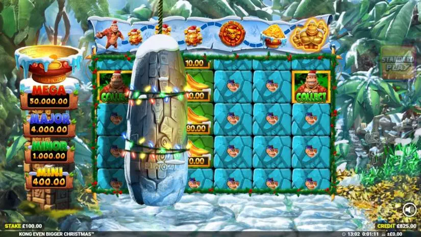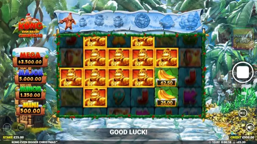 Players can play power play in the Kong Even Bigger Christmas slot at any time by clicking the power play button. Players can play with 5x the bet. During power play, only the cash prize, cashpot, and collect symbols are active. Players can change the power play bet at any time by clicking the bet button. Players can return to the standard reels by clicking the standard play button.