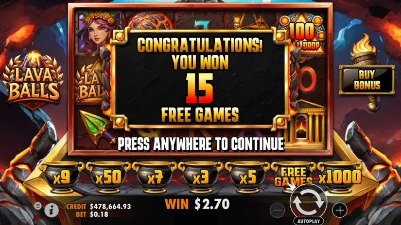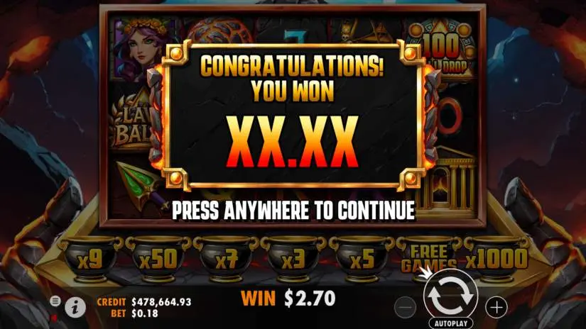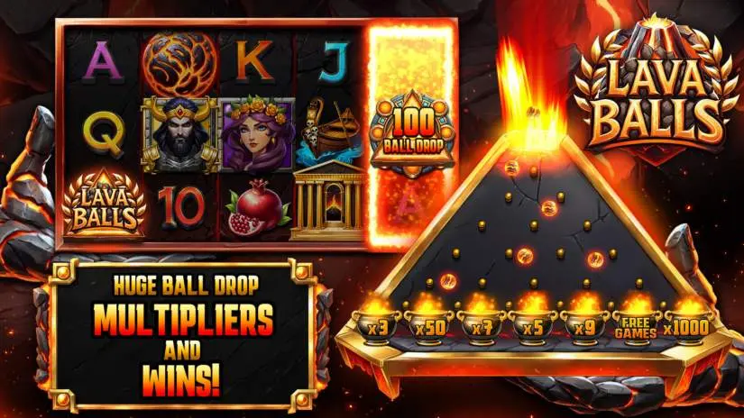 Each time the LAVA BALLS and BALL DROP symbols appear during a spin, the number of balls shown on the BALL DROP symbol is added to the counter. At the end of the round, after all free spins have been completed, a number of balls corresponding to the number in the counter falls along a grid of pegs into pots below the screen. For each ball, the value of the pot it lands in is added to the total win.
