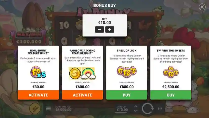 If the player purchases BONUSHUNT FEATURESPINS™, the theoretical return to player (RTP) is 96.13%. For full details on this feature, see the section above. Each spin triggers the bonus game 5 times more often! Volatility: Medium.