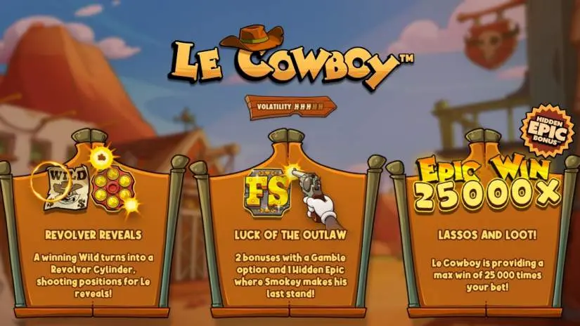 The maximum win in Le Cowboy is 25,000, multiplied by the current bet level. The maximum win can be achieved by activating certain combinations and/or features.