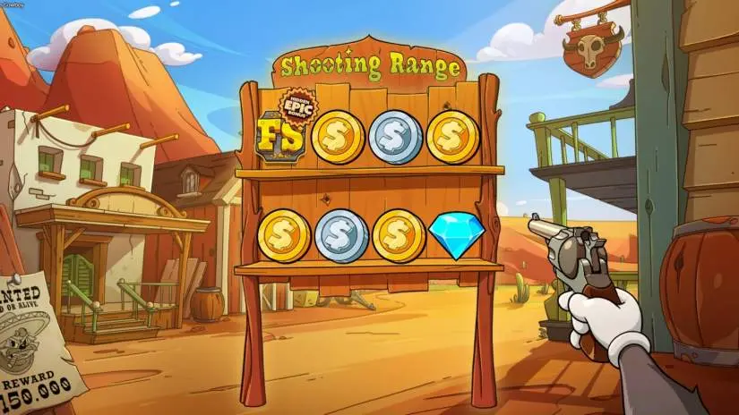Symbols hit by the revolver’s reel reveal special symbols: coin scatters, diamond scatters, clover scatters, loot bag scatters, and reload scatters. After all the shots, if a reload symbol appears on the grid, it activates and reloads all revolver reels with 2-6 shots, revealing new special symbols. If a coin is hit by the reel again, it upgrades to the next coin level. If a green clover is hit by the reel again, it becomes a golden clover. Diamonds, golden clovers, loot bag scatters, and reload symbols cannot be hit again. Only one reload symbol can appear on the grid at a time.