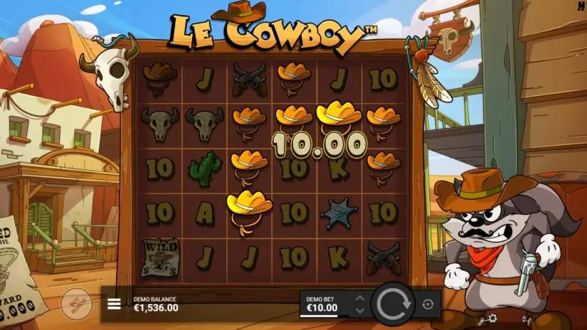 To get a winning combination in the Le Cowboy online slot, 5 or more adjacent symbols must appear anywhere on the playing field.