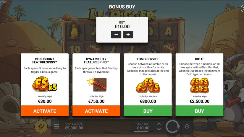 The RTP for the DIG IT bonus buy round is 96.33% without the Risk Game and 96.23% with the Risk Game, always one-time. For full details on this feature, see the section above. Choose between the Risk Game or 10 free spins with the Explosion Gauge, which, when filled, increases the minimum Coin type for openings! Volatility: High.