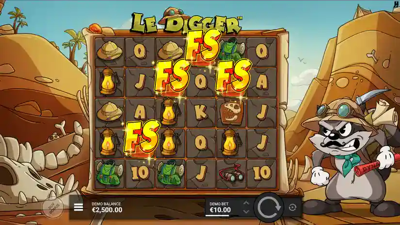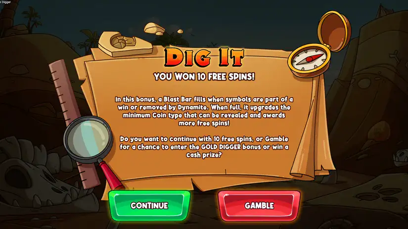 Activate this bonus with 10 free spins by landing four FS Scatter symbols simultaneously in the main game. This takes you to the Bonus Risk Game, where you can choose to play the DIG IT Bonus Game or the Risk Game.