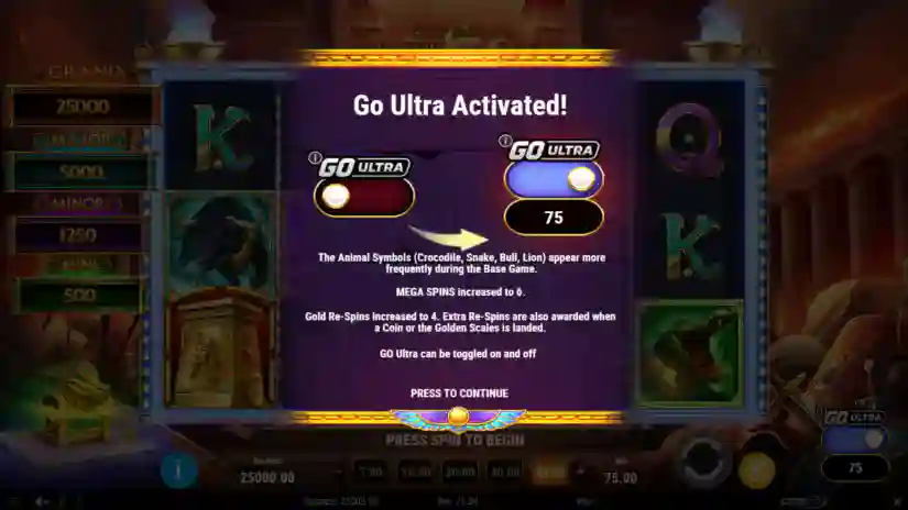 Landing 6 Gold Coins activates 3 Gold Re-Spins, where only Gold Coins and Golden Scales can land. Gold Coins will remain on the reels until the end of the feature. If a Gold Coin lands, the remaining Gold Re-Spins are reset to 3. After the Gold Re-Spins are complete, all Gold Coin values on the reels are paid. Each Gold Coin will randomly have one of the following values (x total bet): 1x, 2x, 3x, 4x, 5x, 6x, 7x, 8x, 10x, 12x, 16x, 20x, 30x, 40x, 50x, 60x, 80x, 100x, 150x, 200x, 300x, 400x, 500x, 1000x.