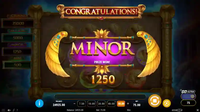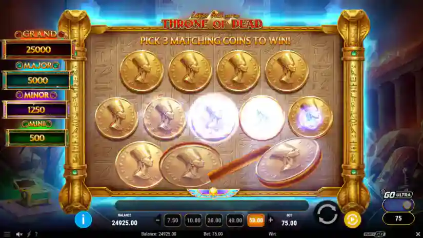 During the Picker Game, the player will select three matching Gold Coins to win either a Mini (10x), Minor (25x), Major (100x), or Grand (500x) instant prize.
