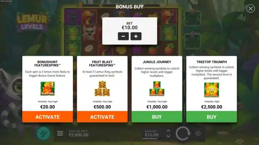 If the player purchases FRUIT BLAST FEATURESPINS™, the theoretical return to player (RTP) is 96.28%. For full details on this feature, see the section above. FS symbols cannot appear in this game mode. At least 3 Lemur King symbols are guaranteed. Volatility: Very High.