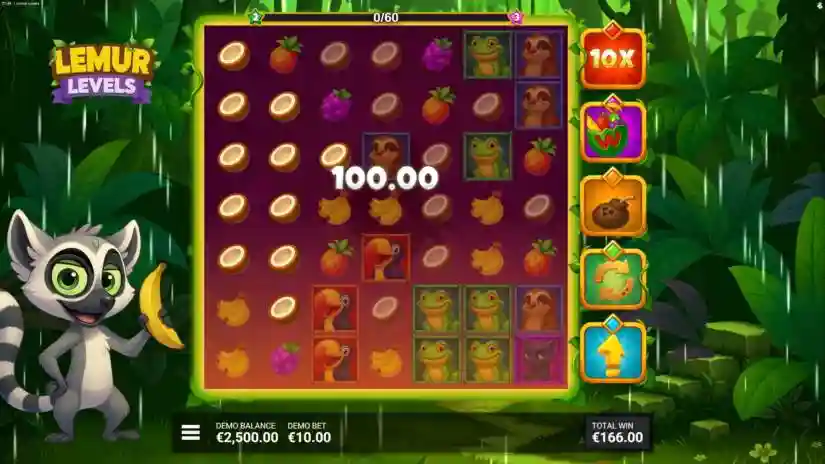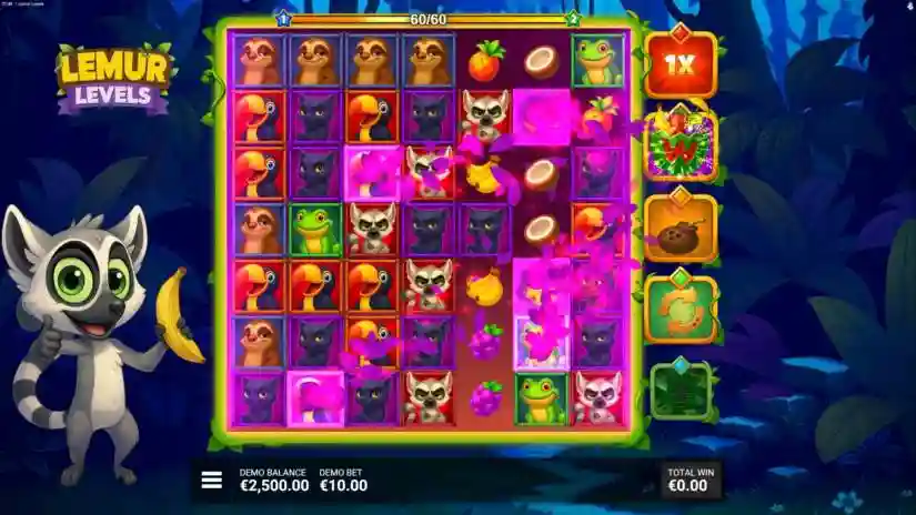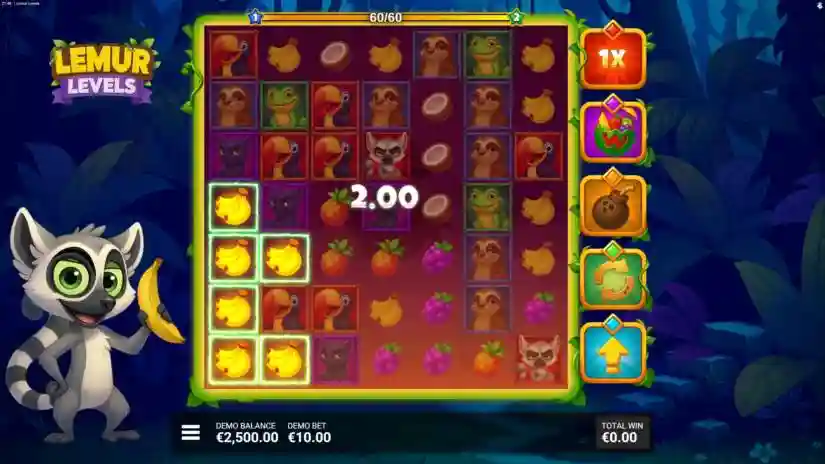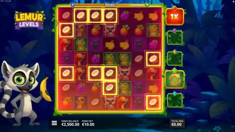 Conquer the top in “Lemur Levels”! Join the mischievous lemur on a delicious jungle adventure in “Lemur Levels”—a colorful 7×7 cascading cluster game filled with fruity fun and powerful winning boosters. Match 5 or more matching symbols to win, and the cascading reels can trigger multiple wins in a row. The Lemur King brings extra energy every time he contributes to a win, activating one of five random boosters that can transform the grid in surprising ways! Watch as boosters change symbols, add Wild symbols, reset the grid, or even activate massive win multipliers. Every spin can surprise you with new combinations and growing potential!