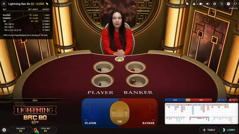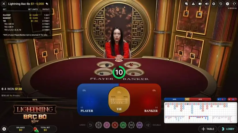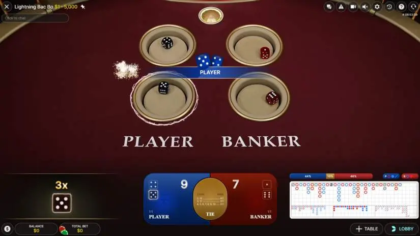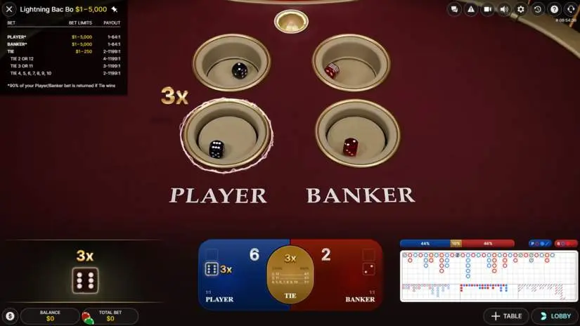 Lightning Bac Bo from Evolution Gaming is an exciting gambling game played with four regular dice and blitz multipliers from 2x to 8x. The goal of Lightning Bac Bo is to predict which hand will win with the highest total on both dice. Each round, a blitz number with a multiplier is randomly selected, giving a chance to multiply the payout on the winning hand.