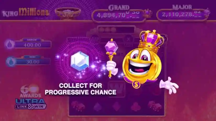 Locating a King Millions™ token on reel 5 in the main game increases your collection jackpot. The in-game collection animation is for visual entertainment only and does not affect the awarding of features or prizes. This feature is only available in the main game.