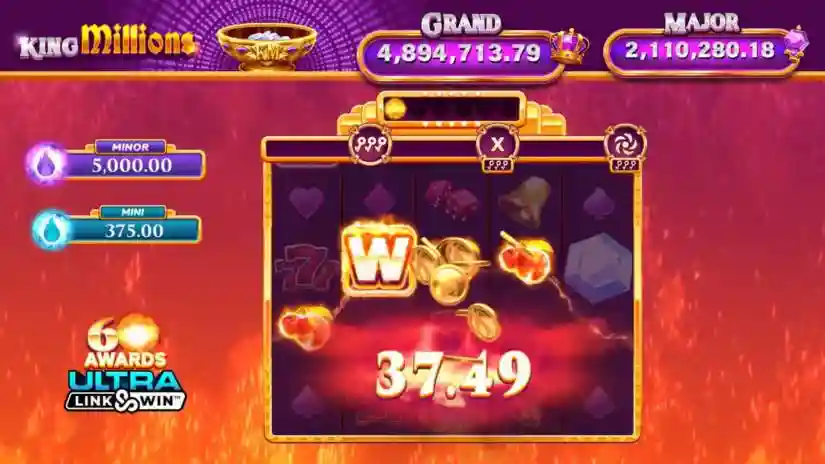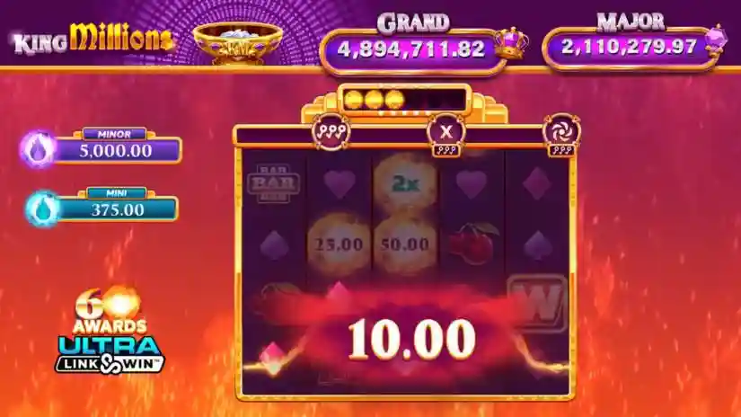 The King Millions™ progressive jackpot is available for winning: the Huge and Grand Jackpot. The game displays the current progressive jackpot value. Cash prizes range from 7x to 100x your bet. If a symbol win occurs simultaneously with a feature, the symbol win is awarded before the feature begins.