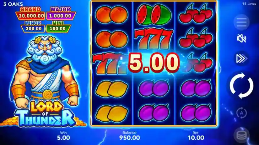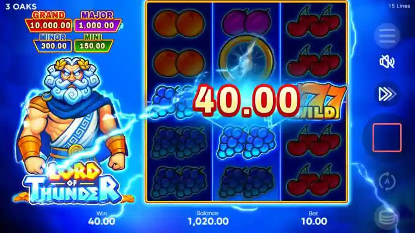 The Lord of Thunder paytable is dynamic and displays winning values depending on the selected bet. The highest-paying combination from left to right is paid. The number of lines is fixed at 15. Simultaneous or matching wins on different lines are added together and paid out. The highest-paying combination on a line is paid out.