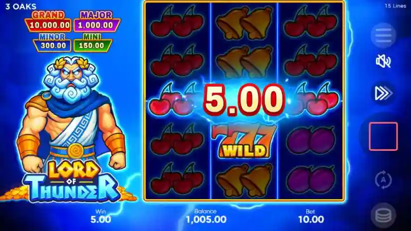 Wild symbols can appear on all reels in Lord of Thunder by 3 Oaks Gaming, but only in the base game. Wild symbols substitute for all symbols except BONUS, COLLECT, and JACKPOT.