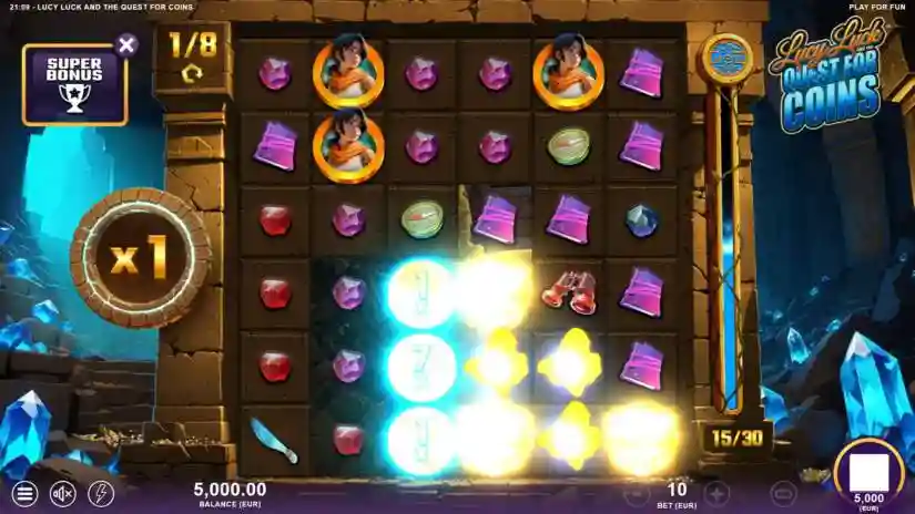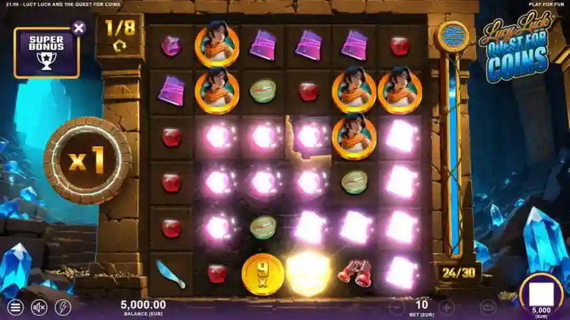 Lucy Luck and the Quest for Coins is a 6-reel, 6-row video slot from Slotmill with an Avalanche feature and cluster payouts. The theoretical return to player (RTP) is 96.01%, and the maximum win is 20,000 times the bet. If the total win during a game round reaches 20,000 times the bet, the round ends and the winnings are paid out. Bets are placed in casino currency, and there are 25 betting levels.