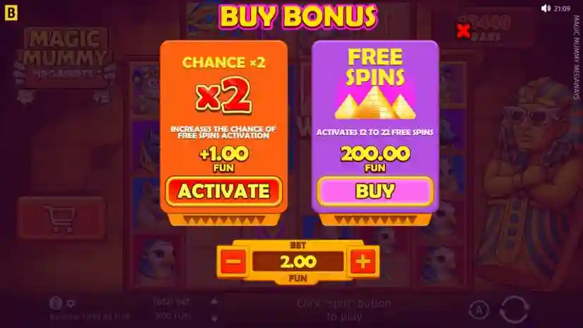 You can purchase a round of free spins. Click the “Buy Bonus” button to see a pop-up window with the price. The price depends on the bet—if the bet changes, the price also changes. The “Buy Bonus” feature is disabled if the “Chance x2” bonus is active. Free spins are triggered on the next spin after purchase.