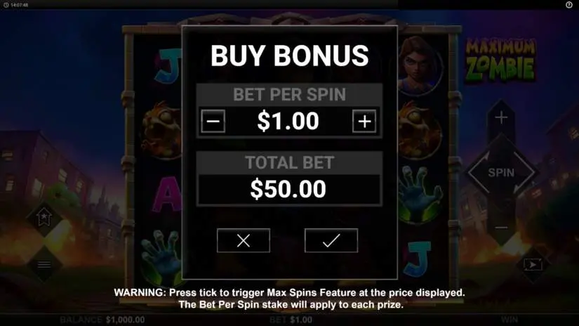 Players can purchase a Max Spins round. The purchase price is 50x the bet per spin. The spin will be triggered, always resulting in 5 or more “SCATTER” symbols.
