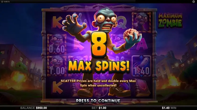 5 or more SCATTER symbols anywhere activate the Maximum Spins bonus round. Each SCATTER symbol represents a prize value. Standard prizes are the total bet multiplied by one of the following multipliers: 0.6x, 1x, 1.4x, 2x, 3x, 4x, 6x, 12x, 20x, or 40x. Players can win prizes in the main game and the Maximum Spins round if they appear in the active area of the collection symbol.