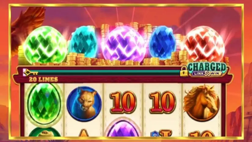 The main game features a Charged counter, which increases by one each time a Mega Eagle symbol lands without triggering the Link&Win™ feature. The counter is capped at 10, and when it reaches this limit, Charged mode is activated. Each time the Link&Win™ feature is triggered while Charged mode is active, the feature starts with 4 spins instead of 3. The spin counter resets to 4 (instead of 3) when a new symbol lands. When the Link&Win™ feature ends, the Charged mode counter resets to the number of active features in the last Link&Win™ feature.