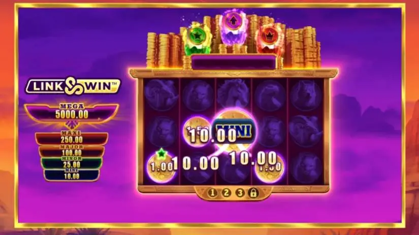 The Link&Win™ feature starts with 3 spins, and each time a new symbol lands, the spin counter resets to 3. After each spin, any visible feature symbol activates its corresponding feature. When the feature is triggered, 5 starting symbols will appear on the reels—one on each reel. These symbols can be either feature symbols or money symbols. The starting feature symbols correspond to the active features. The Link&Win™ feature continues until there are no more spins or until all positions on the reels are filled. When the Link&Win™ feature ends, the values of all symbols and any awarded prizes are added together and paid to the player. If the reels are filled, the player also receives a MEGA Prize. The MEGA Prize is worth 5000x the current bet. The bet amount for Link&Win™ is equal to the last bet you made in the game.
