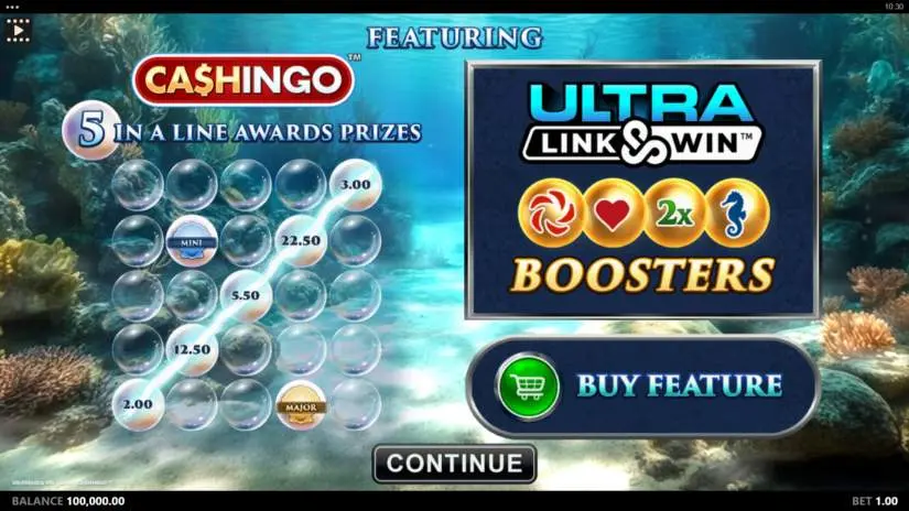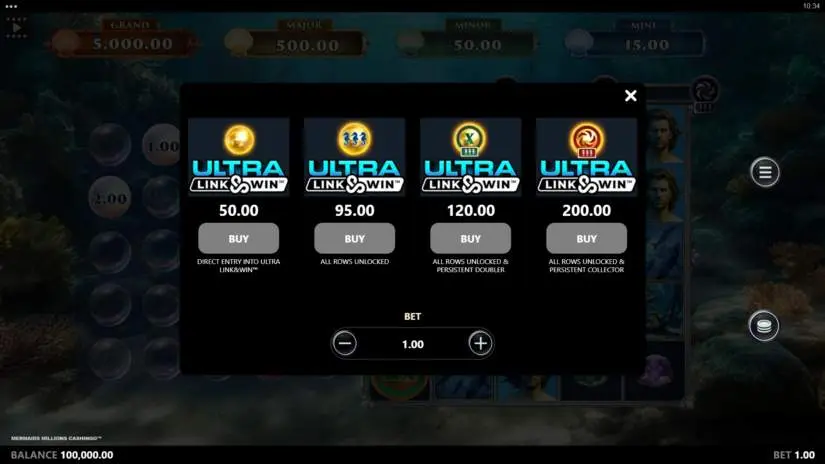 The ULTRA Link&Win™ Multiplier feature costs 120x the bet and begins when all 3 extra lines are active, guaranteeing the landing of a permanent ULTRA Link&Win™ 2x Multiplier Booster Coin.