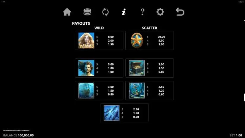This Mermaids Millions Cashingo game features 40 paylines. A payline is a series of adjacent symbols lining up on the reels. A player wins when matching symbols land on adjacent positions that form a payline. Payline wins are calculated from left to right, starting with the first reel. The number of paylines is fixed. Only the maximum win on each line is paid.