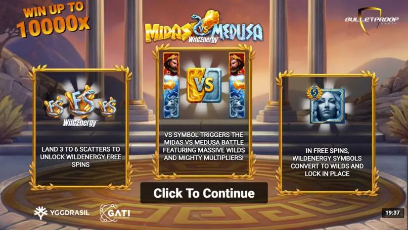 Midas vs. Medusa WildEnergy is a 6×4 video slot from Bulletproof Games with up to 4096 ways to win. The game features VS battles and a free spins feature. All wins pay left to right. The paytable is available in the game menu under “Paytable.”
