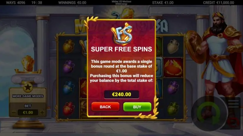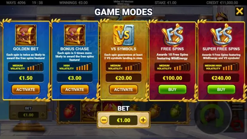 Players in Midas vs. Medusa WildEnergy can activate the Golden Bet to increase their bet size. After activating the Golden Bet, the bet size increases by 50%, significantly increasing the chance of triggering the Free Spins feature.